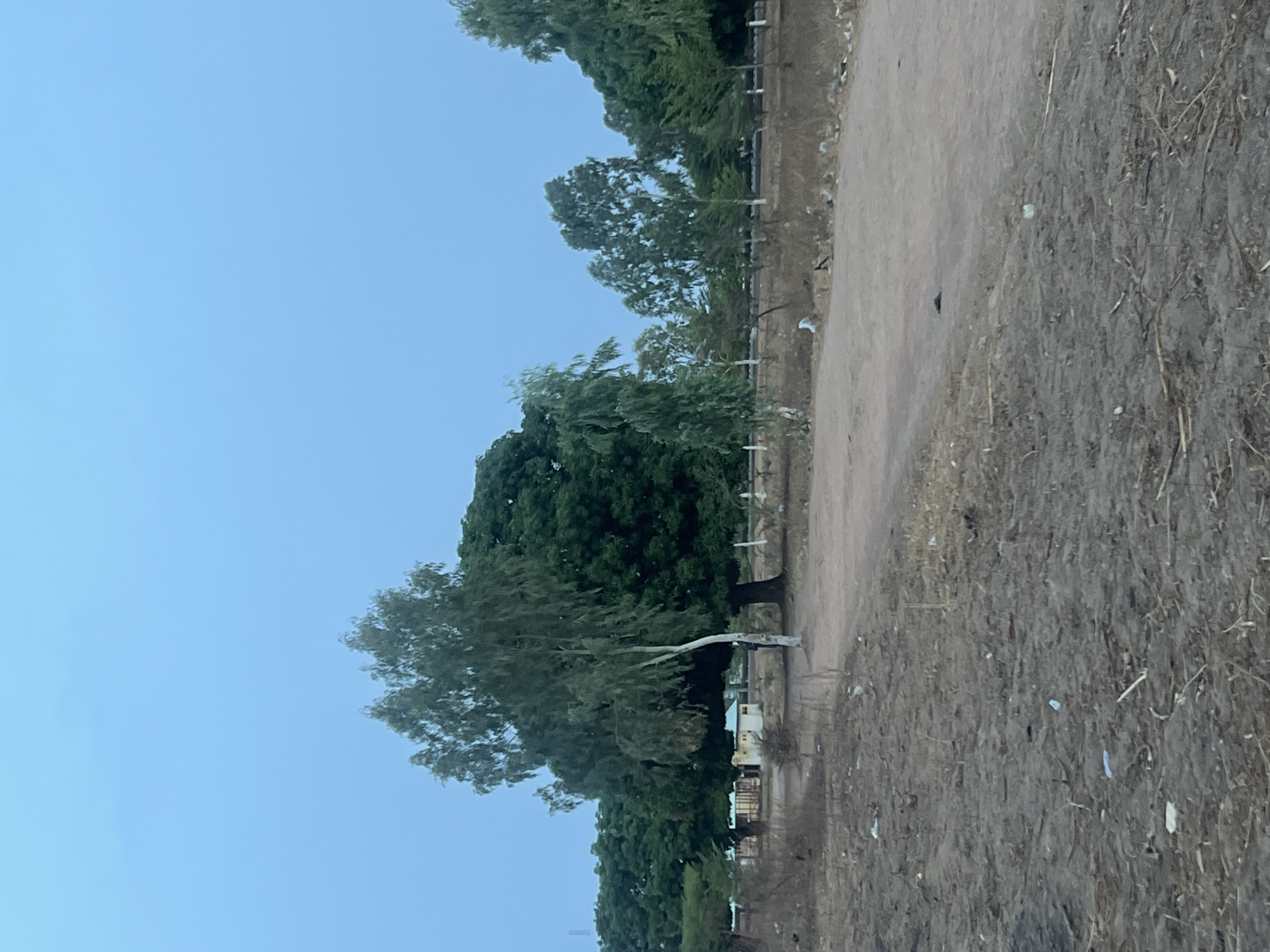 The image depicts a dirt path bordered by trees and vegetation under a pale blue sky. The location is in Unknown, Nigeria. In the middle ground, a large tree with dense foliage dominates the scene. Beyond the path, there is a hint of structures, possibly buildings. Debris and scattered straw are present on the ground. There are no visible people or actions.