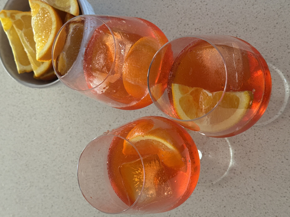 Three glasses of orange-hued cocktails rest on a textured surface. Each drink features a slice of citrus fruit and likely ice, suggesting a refreshing beverage. A small dish beside the glasses holds additional citrus slices, possibly lemon or orange wedges. The scene is captured from a top-down perspective, emphasizing the vibrant colors of the drinks and fruit against the neutral background.