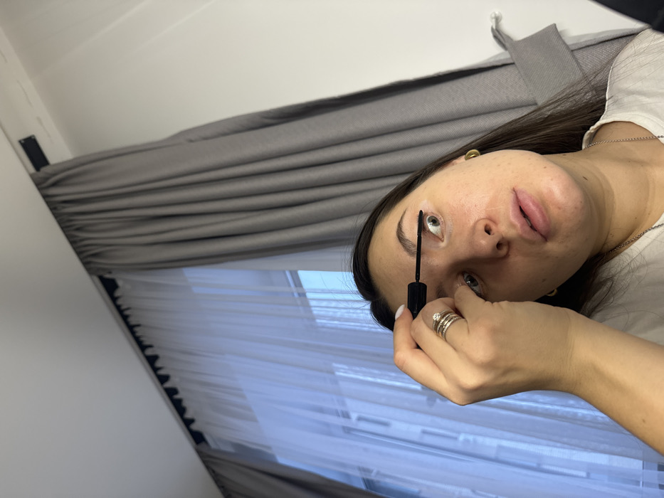 The image captures a female subject indoors in Akulovo (Gp Kubinka), Russia. The subject, with dark hair, is seen from the chest up, applying black mascara to her upper right eyelashes using a black mascara wand held in her right hand. Her left index finger and thumb hold her left eyelid open. She is wearing a white top, a silver-colored chain necklace, and five rings stacked on her left ring finger. A gold-colored stud earring is visible in her right ear. The background features a window with an inner sheer white curtain and outer pleated grey curtains. Faint outlines of building structures are discernible through the sheer curtain. A white ceiling is visible at the top of the frame.