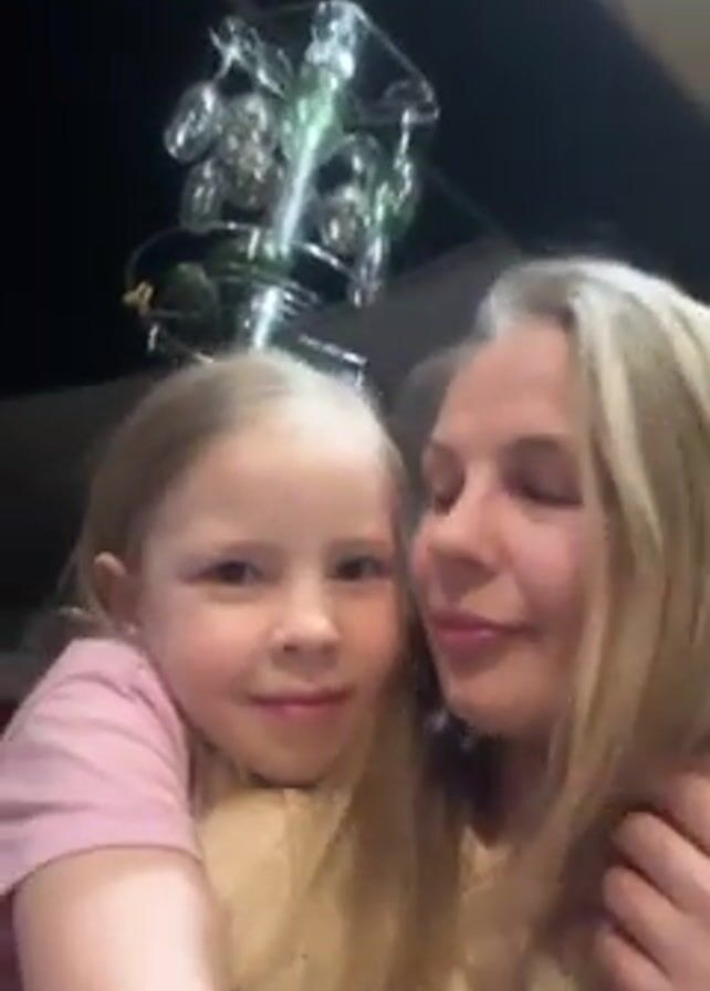 A video shows a light-skinned woman with long blonde hair and a light-skinned girl with blonde hair embracing