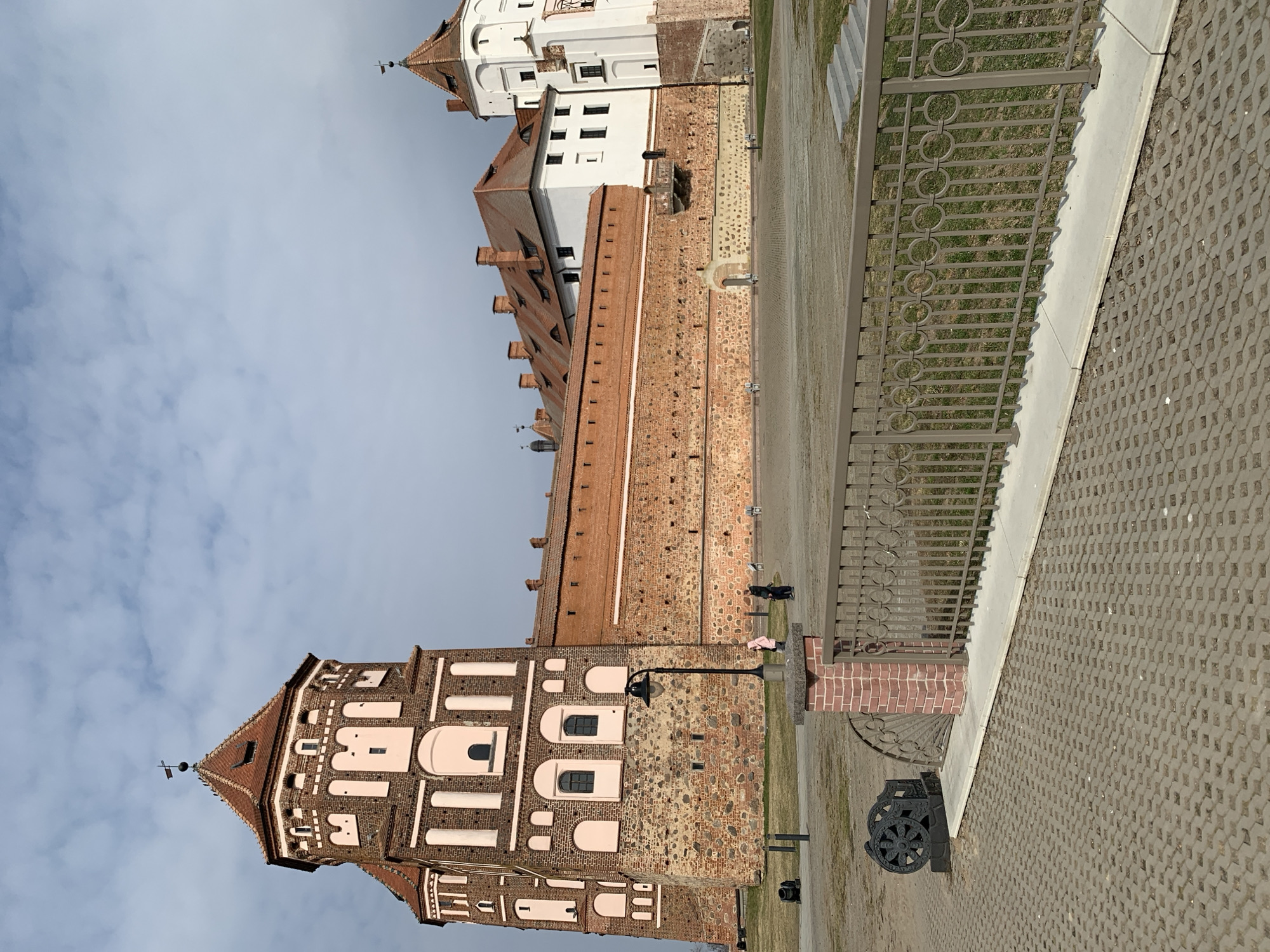 The image displays the Mir Castle Complex in Мірскі сельскі Савет, Belarus, under an overcast sky. The foreground features grey interlocking pavers and a low, dark-grey metal fence with circular decorative elements, supported by a short brick pillar on the left. Adjacent to the pillar, a dark, wheel-like decorative metal object is positioned on the pavers. Beyond the fence, a patch of sparse, dry grass is visible, with a set of grey steps ascending on the far right. The Mir Castle dominates the mid-ground and background. On the left, a tall, multi-story tower with a red-tiled conical roof and a finial is prominent. This tower is constructed primarily of reddish-brown brick, accented with lighter pink plaster panels and white trim around its various arched and rectangular windows. Connecting this tower to the central part of the complex is a robust, red brick wall built upon a stone foundation. A black streetlamp stands on the paved area in front of this wall. Further to the right, behind the wall, a white-faced section of the castle palace is visible, featuring multiple dark windows and red-tiled roofs with chimneys. A smaller, white-faced tower with a red-tiled conical roof and finial completes the visible structures on the right. Several individuals are present on the large paved plaza area in front of the castle wall. One person in a light pink jacket and another in dark clothing are walking towards the left-center of the frame. Other figures are faintly visible further back. No explicit interactions between individuals are discernible.