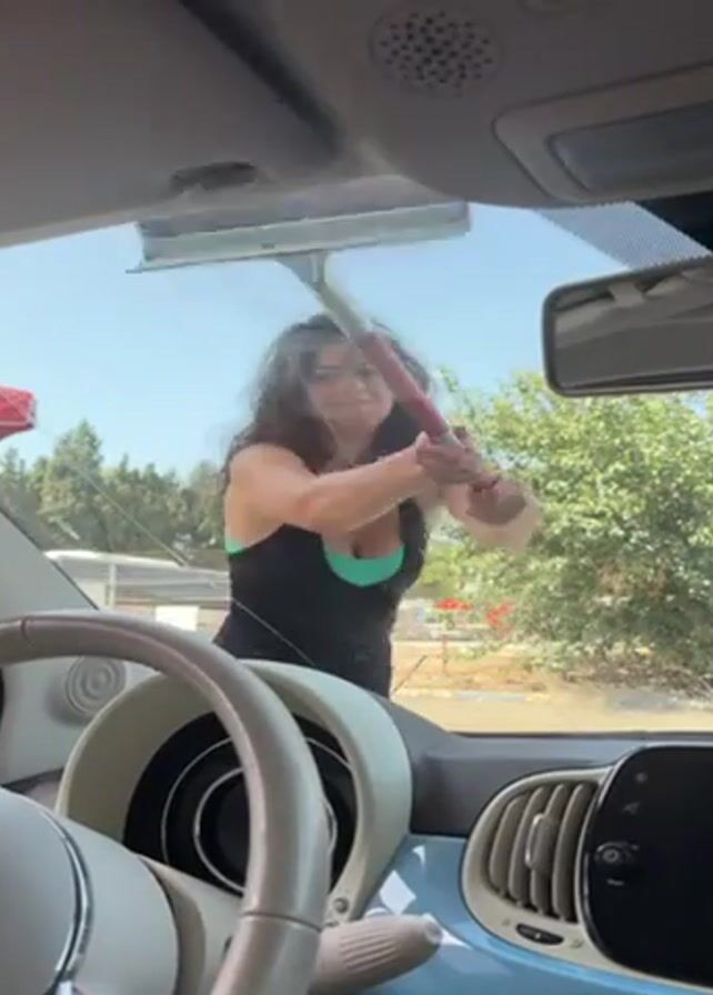 From inside a blue Fiat 500, a woman is seen washing the car's windshield. The woman has long, dark, curly hair and is wearing a black tank top over a bright green bra. She is standing outside the car and using a long-handled brush with a squeegee attached. The weather appears sunny, and trees can be seen in the background along with some other vehicles, including a large truck. The interior of the car is visible, showing the steering wheel, dashboard, and rearview mirror.