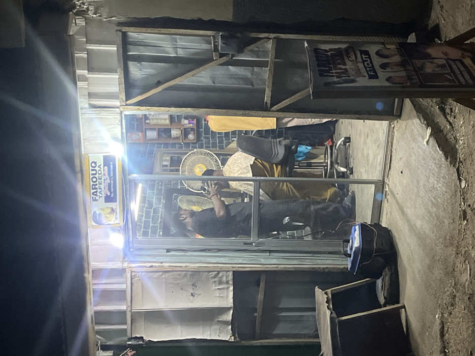 A dimly lit barbershop with a partially open front. Inside, a barber in black attends to a customer in a yellow patterned shirt. A fan circulates the air. An advertisement sign is visible on the right with images of haircuts. Another sign on the left reads "FAROUQ TAFEEDA". The shop appears to be simply constructed, with a metal frame and various items stacked along the exterior. A blue generator sits on the ground to the right.