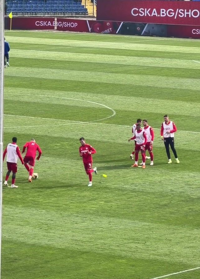 several soccer players wearing red jerseys and white bibs warming up on a green grass field. They're passing a soccer ball between them. The field is lined with white markers and there's a yellow corner flag on the left side of the frame. In the background, there's a crowd of people in stadium seating, and a large banner with the text "CSKA.BG/SHOP". The weather appears sunny.