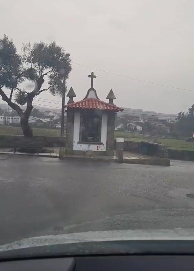 roadside shrine under a gray sky, filmed from inside a car. The shrine is small, square, and white, with a red-tiled roof and a cross on top. There are decorative finials at each corner of the roof. The shrine appears to house a statue or image behind glass. The road in front of the shrine is wet, likely due to rain. To the left of the shrine is a tree, and in the background is a view of a town or village, with various buildings visible. The overall atmosphere is somber and overcast. The camera is stationary inside the car.
