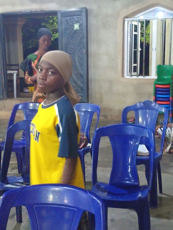 A young person with a tan head covering and yellow shirt stands in a room surrounded by blue plastic chairs. Behind, another person in colorful patterned clothing is visible through an open doorway. To the right is a window with a white frame and bars. Stacks of colorful plastic chairs are next to the window. The room has plain, light-colored walls.
