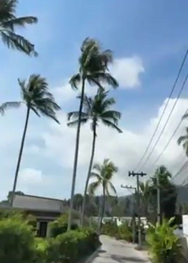 low angle view from a moving vehicle traveling on a paved road in a tropical setting