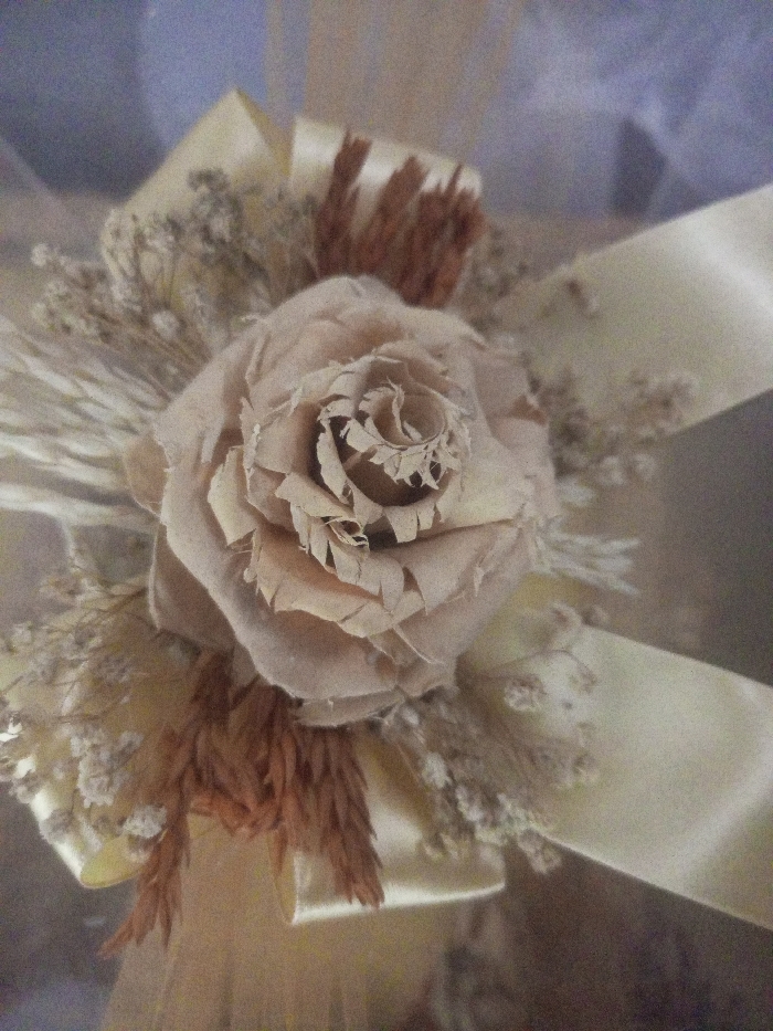 A close-up, angled view displays a decorative floral arrangement featuring a central, light beige fabric rose with visibly frayed petal edges
