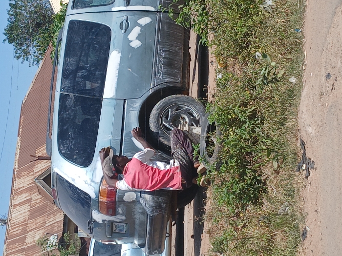 This image depicts an outdoor scene in Jos, Nigeria, under clear, bright daylight. A male individual, dressed in a red and white short-sleeved shirt, dark patterned trousers, and a dark baseball cap, is crouched on the dirt ground, facing the passenger side of a light blue first-generation Toyota Sienna minivan. He is actively engaged in bodywork, with his hands positioned on the vehicle's rear passenger quarter panel, which exhibits multiple light grey patches indicating the application of body filler. The minivan's paintwork appears faded, and the lower sections of the body are soiled. Its windows are dark-tinted, and a roof rack is installed. To the immediate left, the rear section of another, lighter-colored vehicle is partially visible. The foreground consists of a dirt path with patches of green and dry vegetation. Two discarded, flat black tires are situated on the ground near the minivan's rear passenger wheel. In the background, under a clear sky, a building with a severely rusted corrugated metal roof is visible.