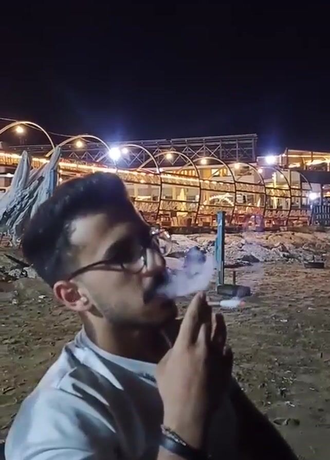 A young man wearing glasses and a light-colored shirt sits in a chair at night and smokes a cigarette. He is fair skinned with dark hair. The area appears to be a beach or sandy area, with what looks like a restaurant or concession stand in the background, lit by several lights. The foreground is littered with debris. He sits still as he smokes.