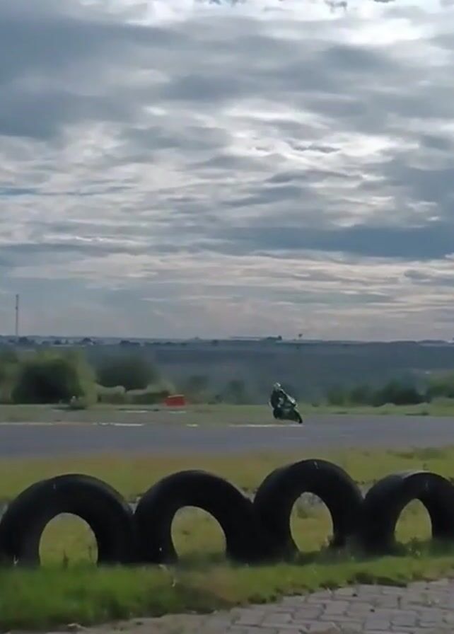 A person on a white and green motorcycle drives on a gray paved racetrack on a cloudy day. The bike is moving left-to-right, away from the camera, in the center of the shot, behind a row of black tires. The landscape beyond the racetrack includes trees and low-lying hills. The camera follows the motorcycle briefly before stopping.