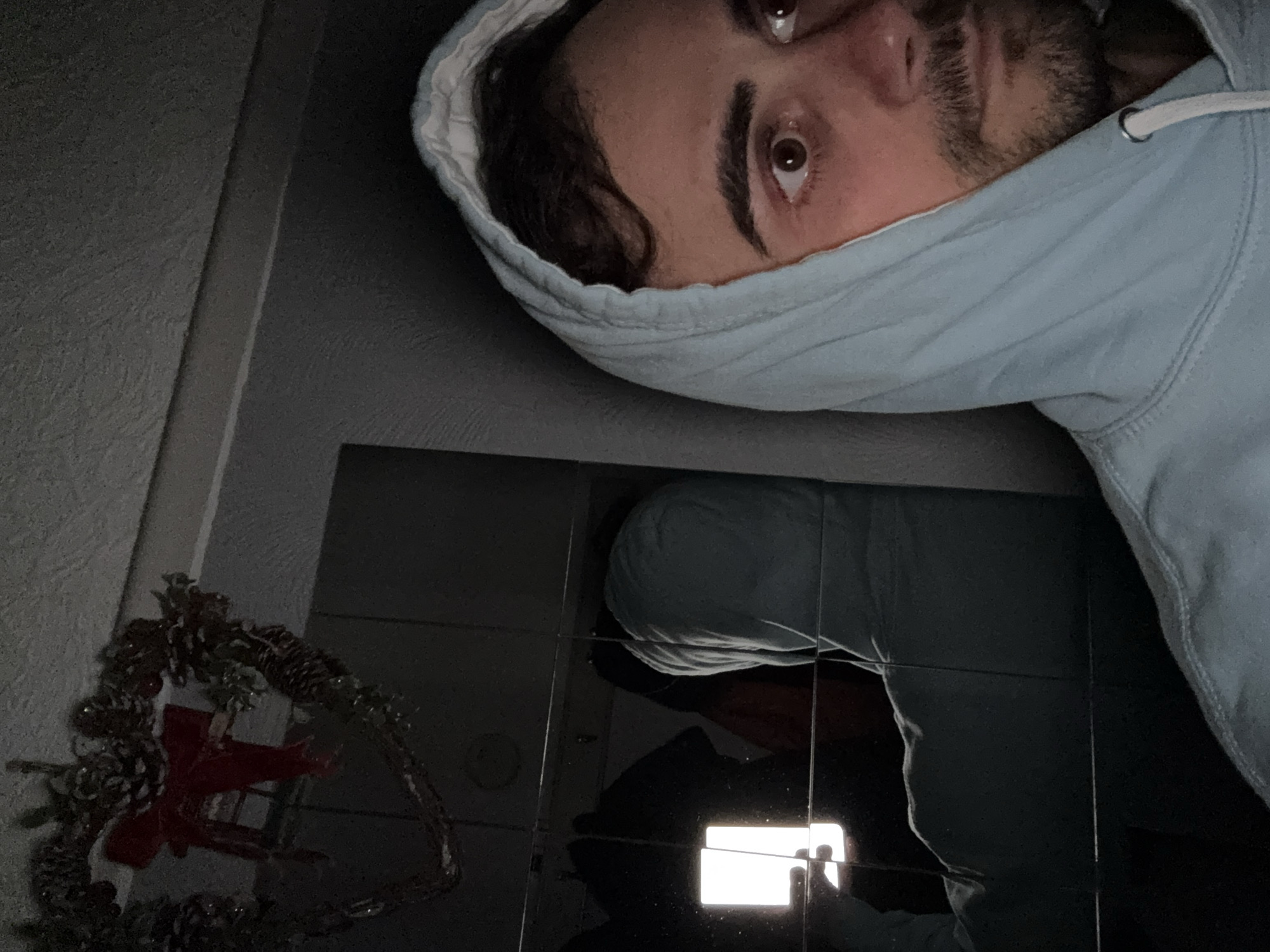 This image depicts an indoor scene within the city of Coventry, United Kingdom, characterized by low light conditions. The primary subject is a male individual, shown from the chest up, wearing a light blue hooded sweatshirt with a white drawstring. His head is turned slightly to the right, with his brown eyes open and directed off-frame. He has dark, curly hair visible beneath the hood and a short beard or stubble. To the left of the individual, a large mirror reflects the back of his hooded head and shoulders. Within this reflection, a brightly illuminated, rectangular object, consistent with a smartphone screen, is visible, suggesting the individual is taking a mirror selfie. The mirror itself appears to be composed of multiple dark, segmented panels. Behind the reflection of the individual, indistinct dark shapes are discernible, possibly hanging garments. In the upper left quadrant of the image, partially obscured, a heart-shaped decorative wreath is visible. It is constructed from pinecones and foliage, featuring a distinct red bow at its top. The surrounding walls and ceiling appear dark and textured, further emphasizing the dim lighting of the environment.