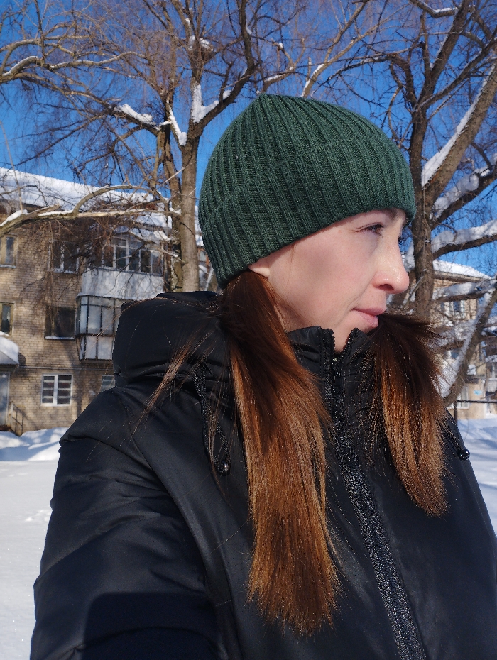 - "A woman with auburn hair wears a dark green knit cap and a black puffer jacket, looking to the right" by FM-5c5Ta2, licensed under CC BY 4.0