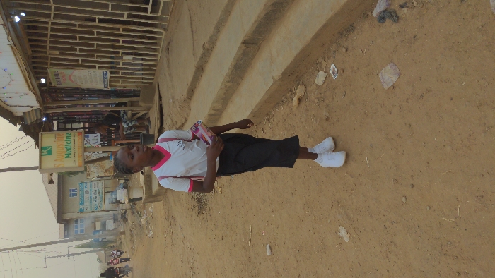A girl with braided hair stands on a dirt path, wearing a white and pink collared shirt, a black skirt, and white sneakers. She holds a pink and purple object in her left hand. Behind her are buildings, one with a pharmacy sign, and a staircase leading up to a storefront. Litter is scattered on the ground near her feet. Other pedestrians are visible in the distance.