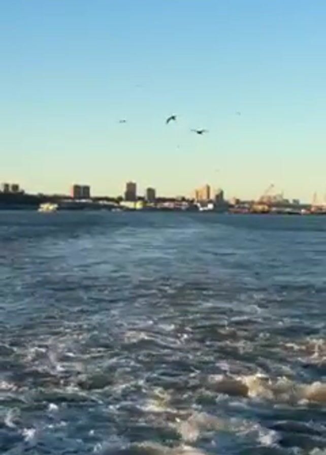 The video depicts a boat's wake moving across a body of water towards a distant cityscape under a clear blue sky. Several birds are flying in the sky above the water. The cityscape is composed of buildings of varying heights. There is a brief audio snippet containing speech.