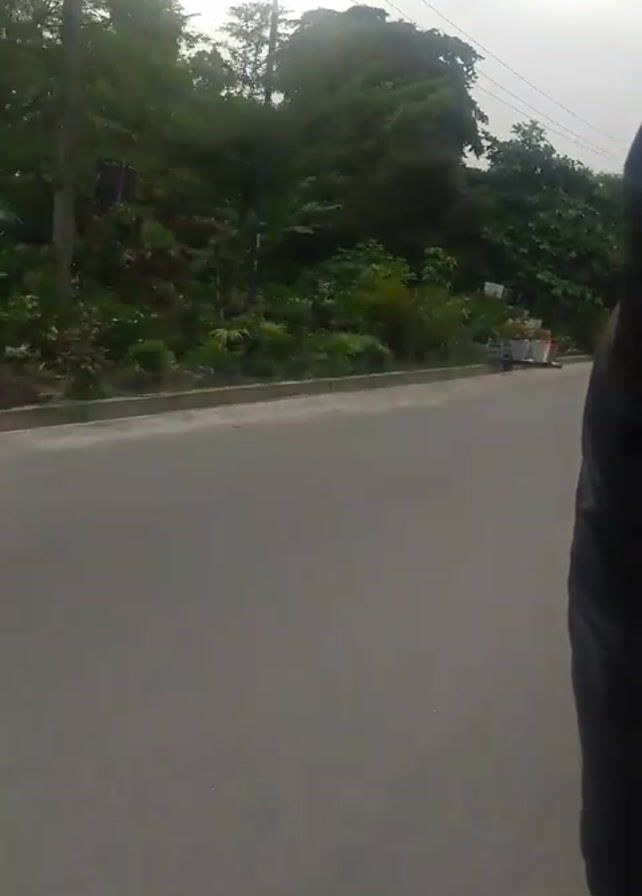 view from a moving vehicle on a paved road with trees and vegetation on the side