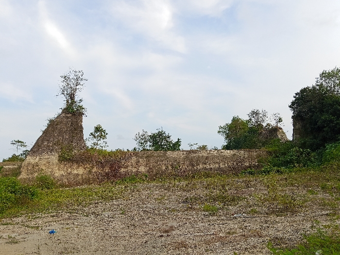 The image displays an outdoor scene in Lhokseumawe, Indonesia, featuring an eroded earthen landscape under a light blue sky with scattered white clouds