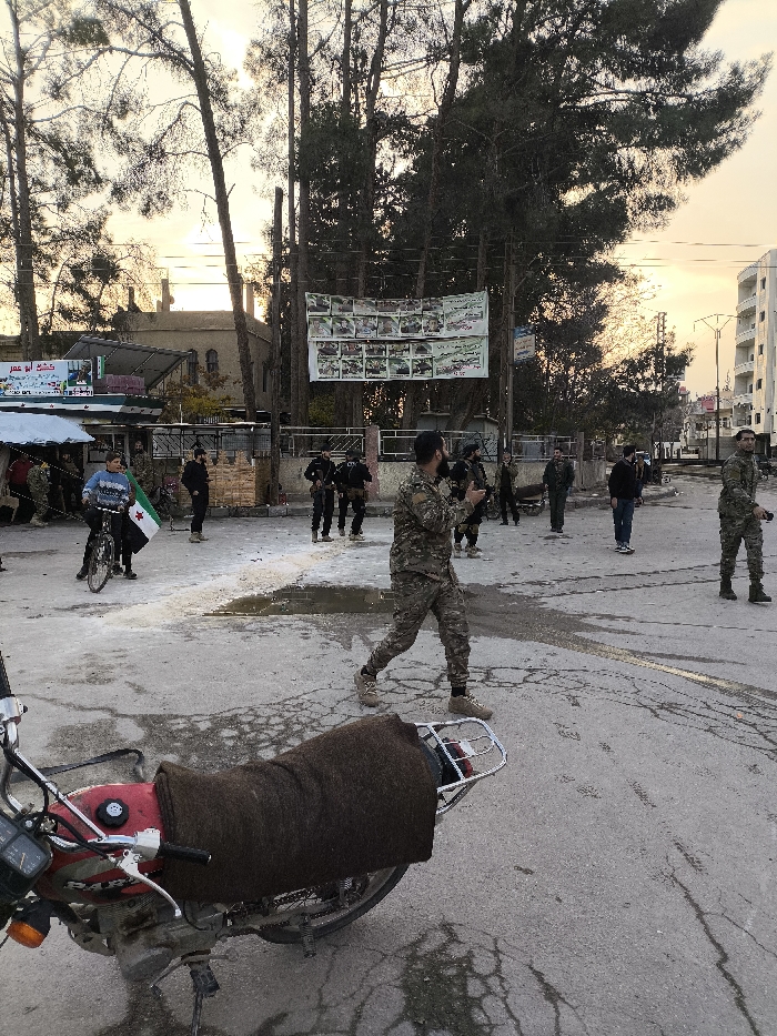 This image depicts a street scene in Jirud, Syria, at dusk or dawn, characterized by a low sun casting warm light from the upper left. The foreground features a red motorcycle with a dark brown blanket draped over its seat and rear rack, positioned towards the left of the frame. The asphalt street surface exhibits cracks, puddles, and various tire marks. In the mid-ground, a young male in a blue sweater stands by a black bicycle, holding a Syrian opposition flag (green, white, black with three red stars). To his right, several individuals in dark clothing stand near a makeshift barrier of wooden crates. Further right, a group of at least three men in dark tactical uniforms with visible sidearms are present. A man in a camouflage uniform with tan boots walks towards the right, gesturing with his hands. Another man in camouflage stands on the far right, holding a dark object. Other figures are scattered throughout the background. Behind these individuals, a prominent banner is strung between tall, slender evergreen trees, displaying multiple framed photographic portraits and Arabic text. A smaller banner is partially visible to its left. Buildings are visible in the background: an older, light-colored stone structure with dark windows to the far left, and a modern, multi-story apartment building with balconies to the far right. Utility poles and streetlights are also present.