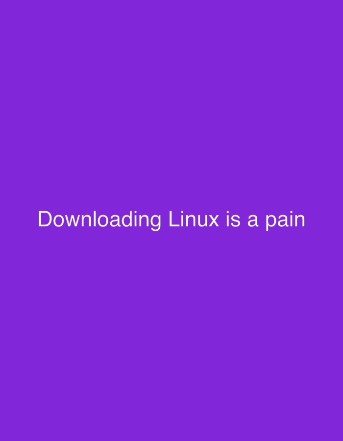 The image displays white text, centered, against a uniform purple background. The text reads: "Downloading Linux is a pain." No individuals, physical objects, actions, or interactions are visually depicted within the image. The environment is a flat, single-color digital display. There is no information within the image content to identify a physical location in the city of Frederiksberg, Denmark.