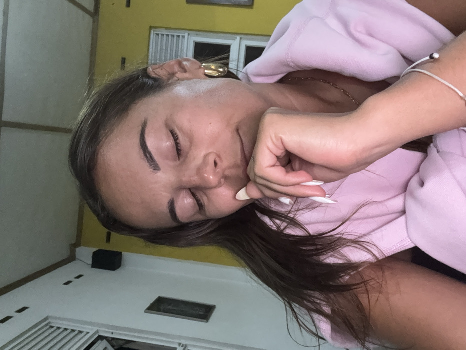 The image depicts a single female subject indoors, located in Bentota, Sri Lanka. The woman, shown from the chest up, has her eyes closed and her right hand positioned with her chin resting lightly on her knuckles. Her left arm is not fully visible. She has medium-length dark brown hair, which falls over her shoulders. Her fingernails are long and painted white. She wears a light pink hooded garment, a thin gold-colored necklace chain is visible around her neck, and a white string bracelet with a dark bead is on her right wrist. A gold-toned, oval-shaped hoop earring is visible in her right ear. The background consists of an interior room with a mix of white and yellow painted walls. To the left, a portion of a white louvered window is visible. Above the window, on the white wall, a dark rectangular object, possibly a speaker, is mounted. Further to the left, a dark-framed rectangular item is affixed to the white wall. Exposed wooden beams are visible on the ceiling. The lighting appears to be artificial, casting soft shadows.