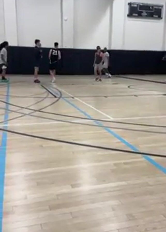 group of young men playing basketball in an indoor court. The camera is positioned on the sideline, offering a partial view of the court. The court has a wooden floor with black, white and blue lines indicating boundaries and playing areas. There are several young men dressed in athletic wear, some wearing jerseys with numbers. In the beginning, the focus is on a player with the ball who dribbles and then jumps to shoot a basket. The camera follows his movement, showing other players either guarding or attempting to get into position. The environment is well-lit, and the walls are painted in neutral colors. A basketball hoop and scoreboard are visible in the background. There is no audio in the video.