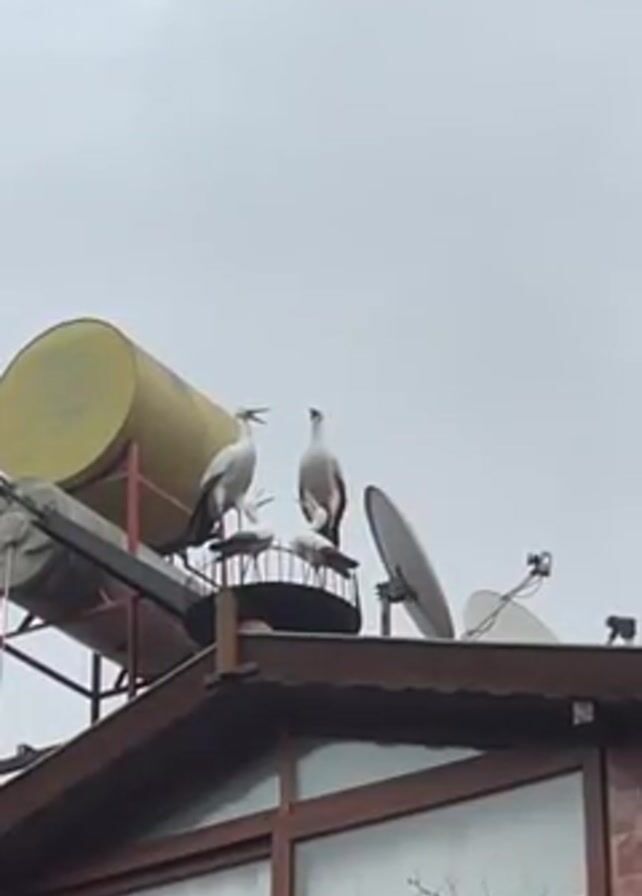 building rooftop with decorative bird figures standing on a platform. The sky is overcast. A yellow tank, likely a water tank, is visible next to a satellite dish. The camera pans up to show the sky and the edge of a red brick structure that appears to be a decorative tower or chimney.