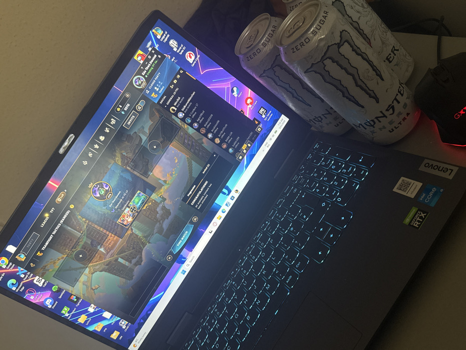 The image displays an indoor gaming setup, location Unknown, Unknown. A black Lenovo brand laptop, equipped with NVIDIA GeForce RTX graphics and an Intel Core processor, is open on a dark, flat surface. Its screen is illuminated, showing the Teamfight Tactics (Ranked) client, displaying a game lobby with character loadout slots, a friend list, and a chat window. The player's name "Kie Theu Phestal" and rank "Diamond III 75 LP" are visible. The laptop's QWERTY keyboard is backlit with a blue/teal light. Windows 11 taskbar icons are visible at the bottom of the screen, along with various desktop application shortcuts including Discord, Microsoft Edge, and game launchers. A webcam privacy slider is affixed to the top bezel of the screen. To the right of the laptop, two white Monster Energy Ultra Zero Sugar cans are positioned, one upright and one slightly tilted. A black gaming mouse with red LED illumination is situated to the right of the laptop, resting on a light-colored mousepad or surface. No individuals are present. The background appears to be a plain, light-colored wall.