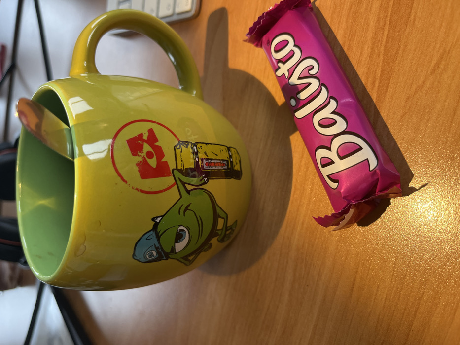 This image depicts an indoor scene in Wasquehal, France, focusing on two primary subjects resting on a light-colored wooden surface: a beverage mug and a packaged snack bar. The mug is large, with a bright yellow exterior and a green interior. It features graphic designs, including the character Mike Wazowski from Disney/Pixar's Monsters Inc., wearing a blue hard hat and leaning on a red and grey scream canister. To the right of the character, the red circular Monsters Inc. logo is visible. A metallic spoon is inserted into the mug, partially submerged in an unseen liquid. Several small liquid droplets are present on the yellow exterior surface of the mug. Positioned in front of the mug is a Balisto chocolate bar, horizontally oriented. It is encased in a magenta-colored foil wrapper bearing the brand name "Balisto" in prominent white lettering with a purple outline. The left end of the wrapper shows a small tear or opening. The wooden surface exhibits a visible grain and reflects light, creating distinct shadows from both the mug and the Balisto bar. The background is out of focus, revealing blurred shapes consistent with a white computer keyboard and other desk items, suggesting an office or workspace environment. No individuals are present in the scene.