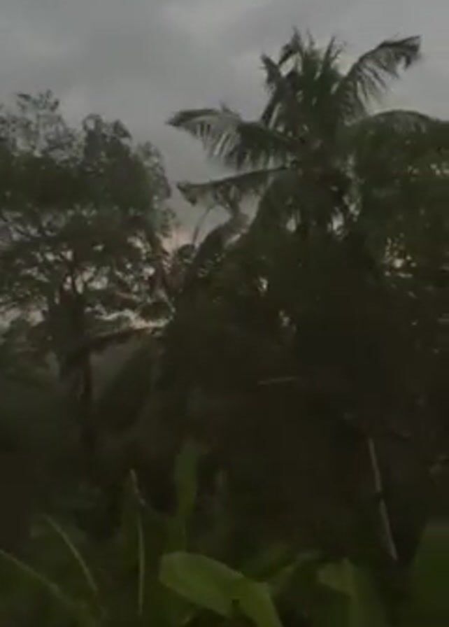 A stormy scene unfolds with dark, turbulent clouds dominating the sky. The wind whips through the lush, green trees, including palms and banana plants, causing their branches to sway violently. The low lighting and overcast sky create an ominous atmosphere. Rain may be falling, though it's hard to discern clearly. Overall, the video captures the power and drama of an intense weather event.