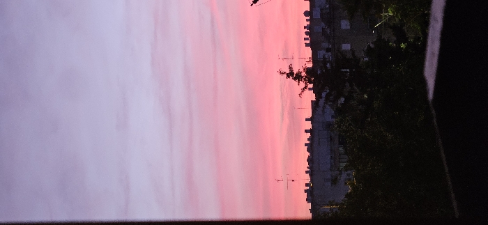 The image depicts an urban landscape within the city of Kiryat Motzkin, Israel, at either sunrise or sunset. The sky, occupying the majority of the frame, exhibits a distinct color gradient, transitioning from a light purple-lavender hue in the upper portion to a vibrant, intense pink and magenta along the horizon line. Faint, horizontal cloud streaks are visible within the colored sky. Below the sky, a dark, silhouetted line of buildings forms the city's skyline. These structures appear to be multi-story, possibly residential or commercial, with various dark, rectangular protrusions on their rooftops, interpreted as chimneys, vents, or other architectural features. Several distinct, antenna-like structures, resembling older model television antennas, extend upwards from these rooftops into the pink sky. Further below the building line, a dense, dark mass of tree canopies is visible, obscuring the lower sections of the buildings. A singular, more prominent tree with a somewhat conical shape stands slightly to the right of the image center, silhouetted against the bright pink sky. The immediate foreground is dark and lacks detail, presenting a horizontal band that suggests a balcony railing or window ledge, viewed from an elevated position. A dark, vertical structural element, possibly a window frame, is visible along the far left edge of the image, running from top to bottom. No human figures or specific actions are discernible. The lighting suggests ambient conditions characteristic of dawn or dusk.
