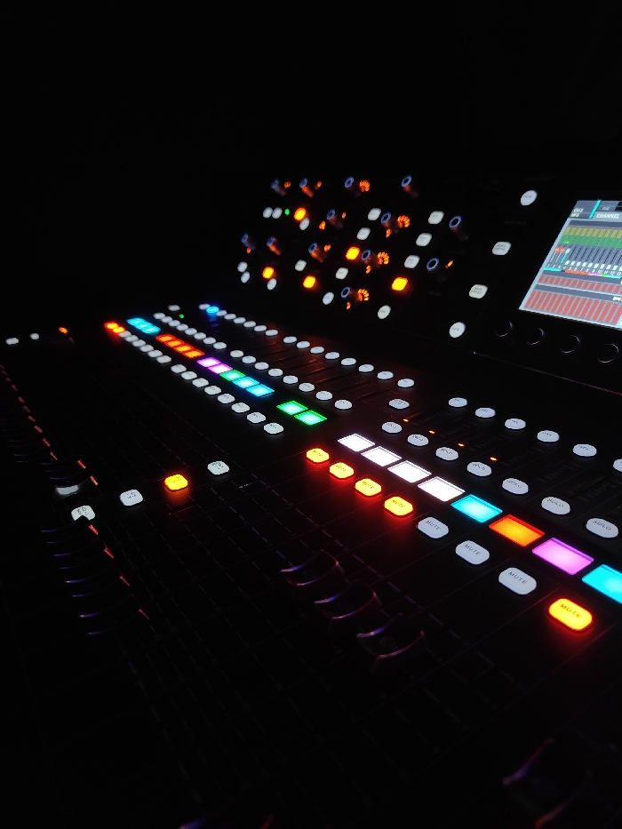 - "A mixing console sits in the dark, illuminated by its own glowing buttons and sliders" by FM-5lleo2, licensed under CC BY 4.0