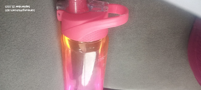 - "A translucent plastic water bottle with a pink-to-orange gradient occupies the right and center portions of the frame, resting on a light gray, textured fabric surface" by FM-nfTWf2, licensed under CC BY 4.0