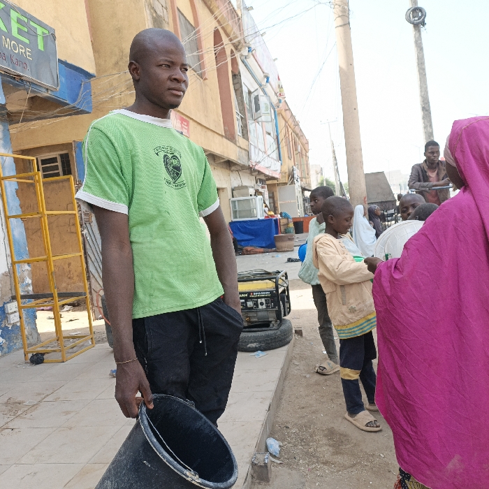 The image displays an outdoor street scene in Kawaji, Nigeria, under bright daylight. In the foreground left, an adult male with a shaved head and dark complexion wears a light green short-sleeved t-shirt with a dark emblem and black trousers. He holds an empty black plastic bucket in his right hand, with his left hand in his pocket, and gazes to the right of the frame. To his right, a partially visible woman in a vibrant pink head covering faces a group of approximately five children. One boy in a light orange long-sleeved shirt and dark striped trousers, wearing sandals, holds a small green item, seemingly in an exchange with the woman. In the mid-ground, a yellow and black portable generator is positioned on a tire adjacent to the paved sidewalk. Behind the generator, a blue tarp covers obscured items. The background features multi-story buildings with light brown facades and blue trim, indicative of an urban environment. A partially visible sign displaying "MARKET," "MORE," and "Kano" text is affixed to a building on the far left, above an empty yellow metal shelving unit. Two utility poles with attached wires are visible on the right side of the frame. The ground transitions from a paved sidewalk in the foreground to an unpaved or dirt surface further into the scene.