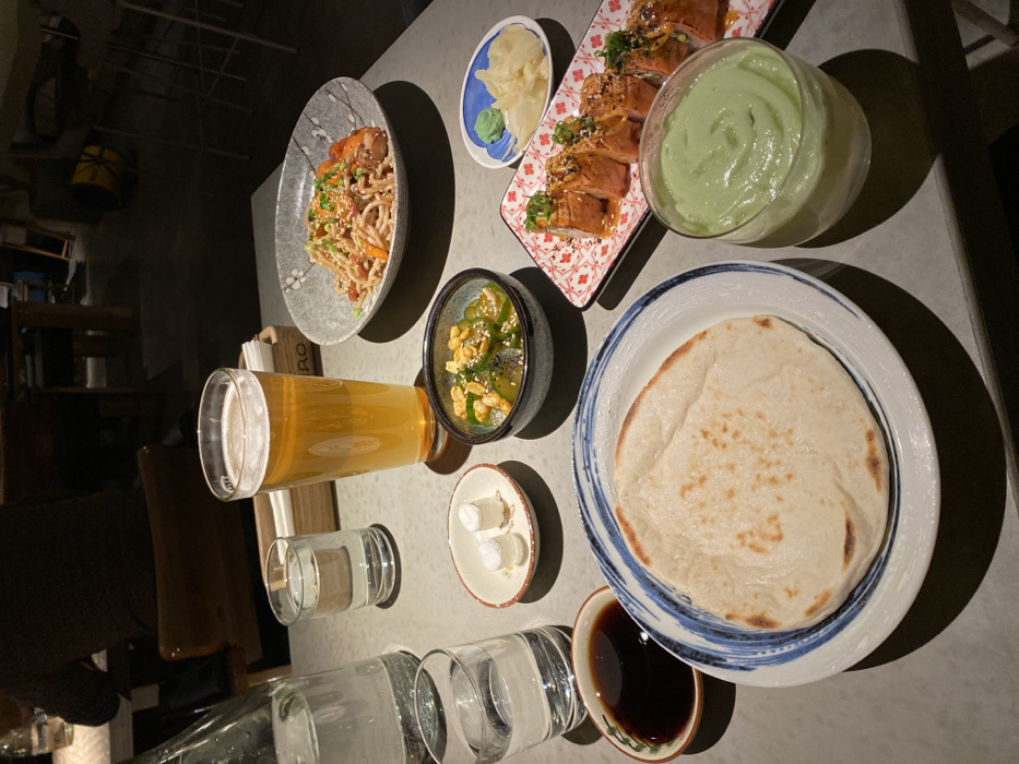 The image depicts a dining table laden with various dishes and beverages within a dimly lit restaurant in Irkutsk, Russia. In the foreground and center, a tall glass of light amber beer with a foamy head stands prominently next to a white ceramic bowl containing sliced cucumbers topped with peanuts. To the left, a clear glass bottle of water and two smaller glasses of water are present. A small white dish holds two small, round white items, possibly marshmallows or confections. On the right side of the table, a grey ceramic bowl patterned with light cherry blossoms holds a serving of noodles mixed with vegetables (including sliced carrots) and reddish meat, garnished with sesame seeds and green onions. Below this, a rectangular plate with a red and white geometric pattern displays five sushi rolls, topped with a sauce and green garnish. Adjacent to the sushi, a small white dish contains green wasabi and sliced pickled ginger. A glass of light green, creamy dip is positioned at the lower right corner. Further to the left, a round white and blue patterned plate holds a piece of flatbread, next to a small dish containing dark soy sauce. In the background, an out-of-focus individual is seated at a wooden table, wearing a dark top. Other blurred tables, chairs, and a bar area are visible, indicating a casual restaurant or pub environment. A wooden holder with the letters "R.O." is partially visible behind the beer glass. The scene is illuminated by ambient lighting, casting soft shadows.