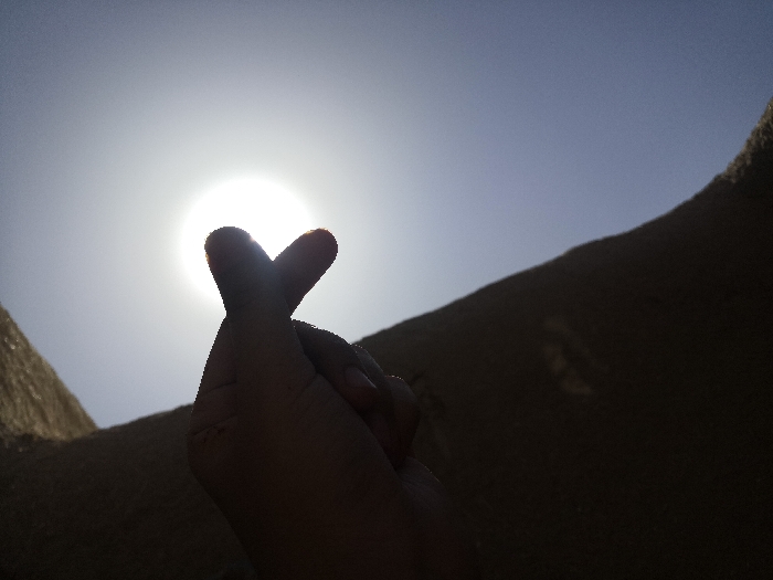 A human hand is prominently featured in the lower center, forming a finger heart gesture. The hand and its fingers are silhouetted against a brilliant sun positioned in the upper center, which casts a bright white halo. The sky above is clear, transitioning from a light blue around the sun to a deeper blue towards the upper right. On the left and right sides of the lower frame, dark, undefined landforms, likely hills or mountains, are visible in silhouette. The image appears to be captured outdoors in bright daylight, specifically in Akhundzadakhail, Pakistan, with the sun low enough to be partially obscured by the hand and landscape.