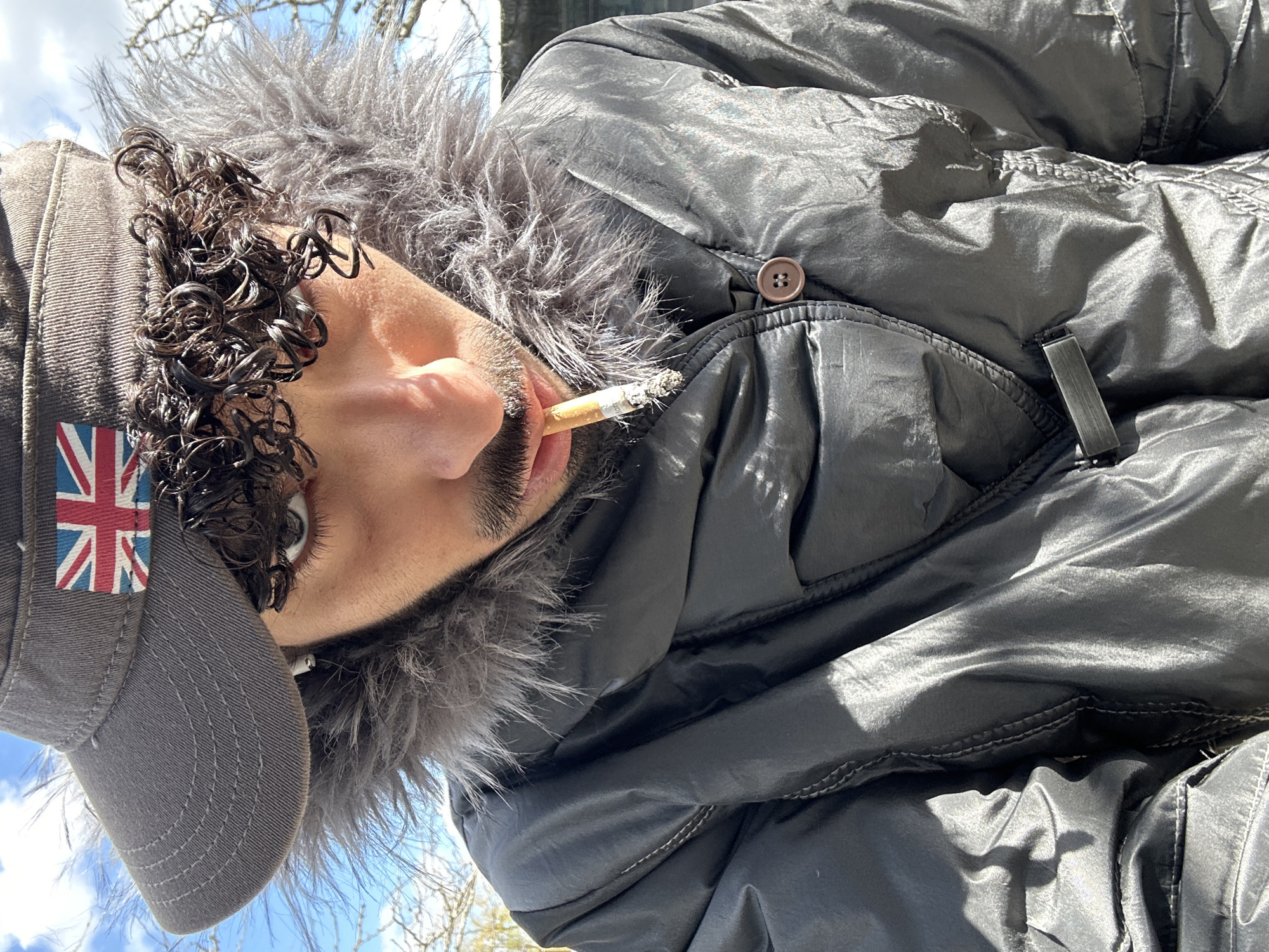 The scene captures a close-up, head-and-torso view of an individual in an outdoor setting in Les Ulis, France, under bright daylight. The subject, identifiable as male, wears a grey military-style cap adorned with a Union Jack flag patch on its front. Dark, curly hair is visible beneath the cap. The subject has dark eyes, a mustache, and beard growth. A white wireless earbud is present in the left ear, accompanied by a small earring. The individual is dressed in a dark grey, shiny puffer jacket featuring a prominent grey faux-fur collar or hood trim. The jacket displays a single brown button on the right front and a metallic clasp on the lower left. A lit cigarette, exhibiting a substantial ash column, is held between the subject's lips. The background is out of focus, showing a blue sky with white clouds and bare tree branches. No specific urban landmarks are discernible within the frame to pinpoint an exact location within Les Ulis.