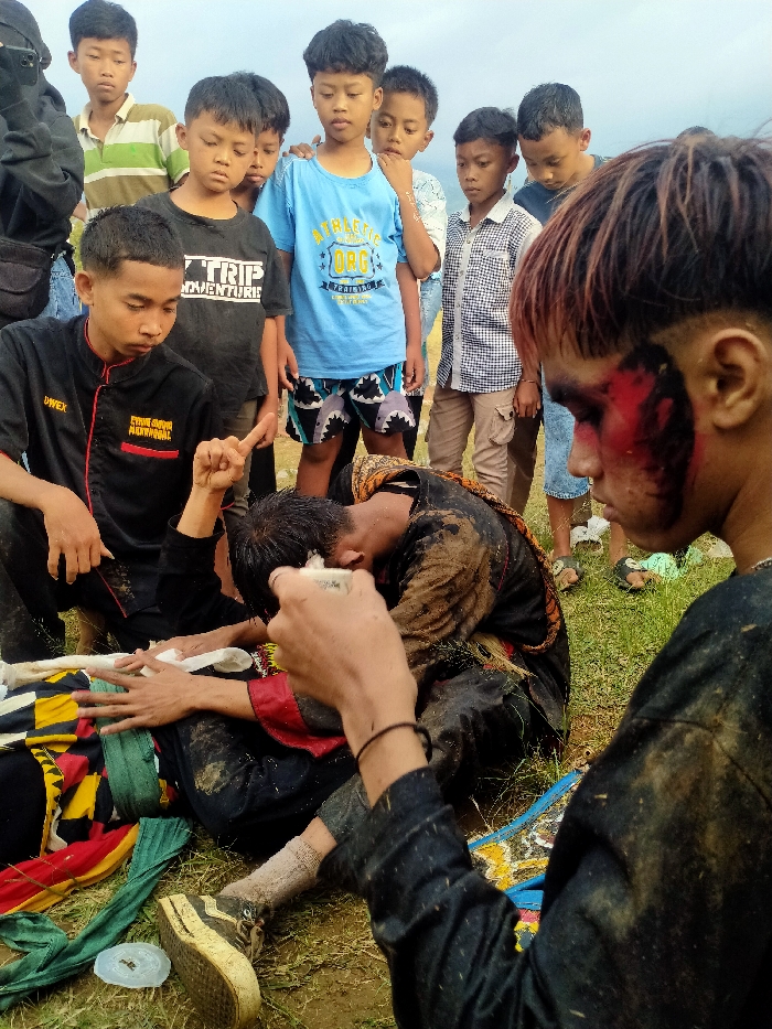 The image captures an outdoor scene on a grassy, muddy field in Sidomukti, Indonesia, under a light, hazy sky. In the foreground, a young male with short, dark hair featuring reddish-brown highlights and distinctive red and black paint on his right cheek and temple, wears a mud-splattered dark long-sleeved shirt. He holds a small white object near the head of another individual lying prone on the ground. This prone individual is heavily covered in mud and wears a dark long-sleeved garment with a patterned, multi-colored fabric (red, yellow, black, green) wrapped around their lower body. A white cloth rests near their head, and their right foot, clad in a dirty, light-colored sneaker, is visible. Adjacent to the prone individual, a third young male, wearing a black long-sleeved shirt with "UWEX" and "ETAN SURO MUKTINDO" text, kneels and points his left index finger upwards, intently observing the prone person. A small, transparent, disc-shaped object lies on the ground nearby. In the mid-ground, a group of approximately seven to eight young boys, ranging from approximately 6 to 12 years old, stand attentively, observing the activity. They wear various casual clothing, including a light blue t-shirt with "ATHLETIC 080" text, a black "TRIP ADVENTURE" t-shirt, and a plaid shirt.