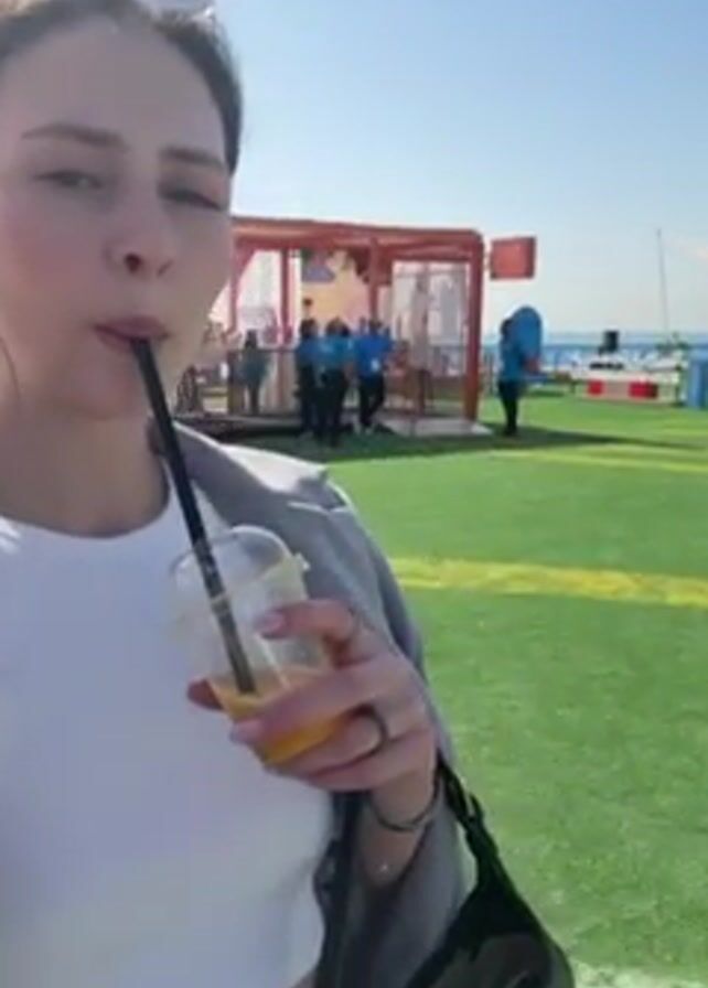 A woman is standing on a green artificial turf field, drinking from a plastic cup with a black straw