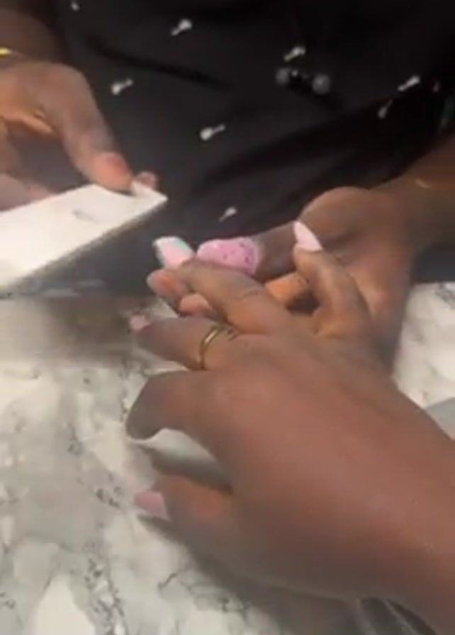 close-up of a person getting their nails done at a salon. A manicurist, wearing a black shirt with a pattern of white guitars, is using a white nail file to shape the nails of the client. The client has dark skin and is wearing a gold ring on their ring finger. The nails are already painted a pale pink. The table between the client and manicurist has a white marble pattern.