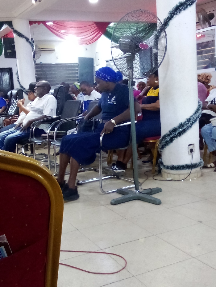 The image depicts an indoor gathering of approximately ten visible individuals, predominantly adults, seated in rows within what appears to be a public or event hall in Lagos, Nigeria. The floor is covered with light-colored, square tiles. A prominent white structural pillar, adorned with dark green tinsel wrapped spirally around it, is positioned on the right side of the frame. A black electrical outlet is visible on this pillar. Adjacent to the pillar and slightly to the left, a dark gray standing fan with black blades is positioned on a four-pronged base. In the immediate foreground, a portion of a red upholstered chair with a gold trim is visible on the far left, partially out of focus. A looped red electrical cable lies on the tiled floor in the lower-left quadrant. People are seated on chrome-framed chairs with black seats. A woman, centrally located and facing slightly to her right (viewer's left), wears a blue headwrap, a dark blue short-sleeved polo shirt, a dark blue skirt, black sneakers, and a gold wrist watch. To her left, an adult male in a black baseball cap, a white polo shirt, and blue jeans is seated, next to a younger individual also wearing a black cap and white top. Further back and to the right, another woman is visible wearing a yellow top and dark skirt. Numerous other individuals are partially visible in the background, seated in similar chairs. The background features a wall with horizontal metallic blinds or slats, a white wall-mounted air conditioning unit, and draped red and green fabric decorations near the ceiling. Individuals are generally oriented forward, indicating a collective focus or period of waiting. No direct actions or overt interactions between subjects are discernible.