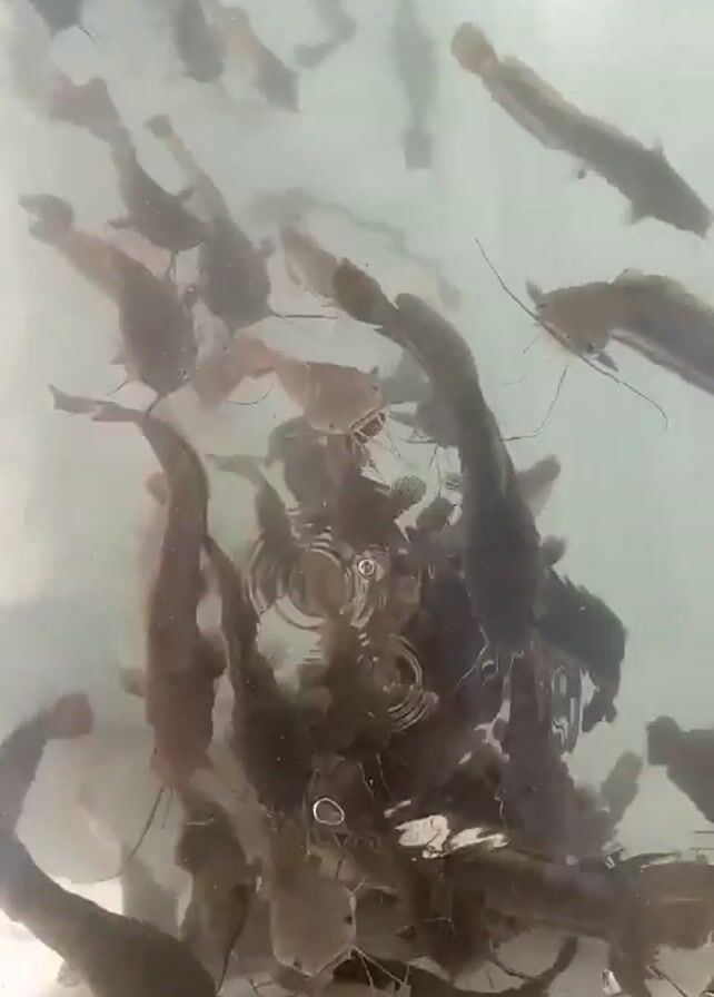 group of dark-colored catfish swimming in a body of water, possibly a tank or pond. The water is somewhat cloudy, and bubbles are visible. The fish are clustered together, with some near the surface and others at the bottom. Their whiskers are prominent. The camera angle is looking down into the water.
