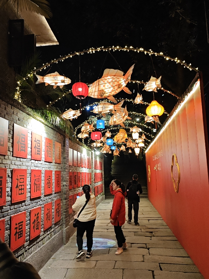 An outdoor pedestrian walkway, likely within a commercial or cultural area, is illuminated at night in Nan'an District, China. The pathway is paved with irregular stone slabs. On the left, a brick wall is adorned with numerous rectangular red panels, each displaying the black Chinese character "福" (fú). A woman in a light-colored jacket and dark pants stands with her back to the viewer, holding a smartphone horizontally, appearing to photograph or video the red panels. Adjacent to her, a second woman, facing partially away from the camera, wears a red jacket and dark pants. Her left hand is raised near her head. Overhead, an arched canopy of string lights illuminates a dense array of suspended lanterns. These include numerous fish-shaped lanterns, predominantly in off-white or light orange, alongside traditional spherical and elongated lanterns in red, blue, and yellow. On the right, a solid red wall extends, featuring subtle white script and a golden, cloud-shaped decorative element. Further up the path, a man wearing a dark jacket and backpack walks away from the viewer. The path continues into a dimly lit, upward slope or stairway in the background.