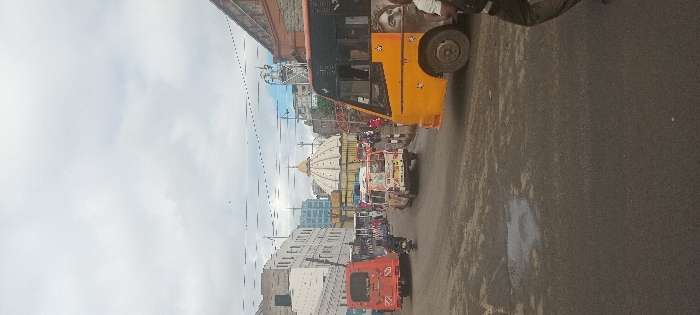 The image displays a busy urban street scene in Nairobi, Kenya, with the prominent Jamia Mosque visible in the background. The sky is overcast, and a small water puddle is present on the dark asphalt road in the foreground. **Location:** The scene is located in Nairobi, Kenya, specifically within the Central Business District, identified by the distinctive architecture of the Jamia Mosque with its large white dome, smaller surrounding domes, and golden finials. **Objects and Subjects:** * **Vehicles:** Multiple public service vehicles (PSVs) are present. In the immediate foreground, a yellow PSV bus is partially visible on the right, showing its front-right quarter, wheel, and side decorated with white stars and a faded graphic. Further back on the left, an orange PSV bus is seen from the rear. Centered in the mid-ground, a white and yellow PSV van (matatu) with various decals is observed from the rear, moving away from the viewer. A motorcycle with a rider is positioned between the two buses, also moving away from the camera. * **People:** A partial human figure, from the waist down, is visible on the far right, adjacent to the yellow bus. Numerous pedestrians are visible on the sidewalks and in the vicinity of the mosque and surrounding buildings in the background, indicating active foot traffic. * **Buildings:** The Jamia Mosque dominates the background, characterized by its multi-domed structure and light-colored facade. To its left, a multi-story, white building is present. To its right, an older, darker-toned multi-story building with multiple windows can be seen. Additional urban structures line the street in the distance. * **Street Furniture/Infrastructure:** Overhead power lines and cables are visible crisscrossing the mid-ground sky. Concrete barriers or bollards separate the roadway from the sidewalk on the right. **Actions and Interactions:** Vehicular traffic appears to be moving or idling on the street, while pedestrians are engaged in transit on sidewalks and possibly crossing the road. The scene depicts a typical busy daytime urban environment.