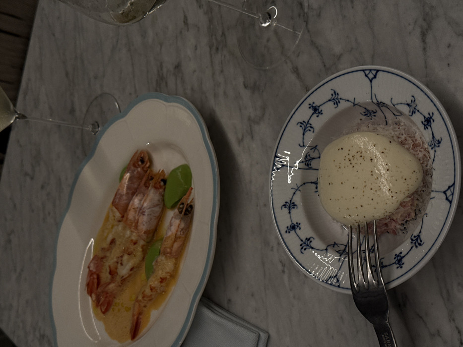 On a marble surface, a table is set for a meal. A plate with three prawns in a sauce, garnished with green leaves, sits near a glass of white wine. A second plate, decorated with a blue floral pattern, holds a mound of shredded crab topped with a smooth, oval-shaped item, possibly a sauce or a poached egg. A silver fork rests on the second plate. The lighting is dim, casting shadows that add depth to the scene.