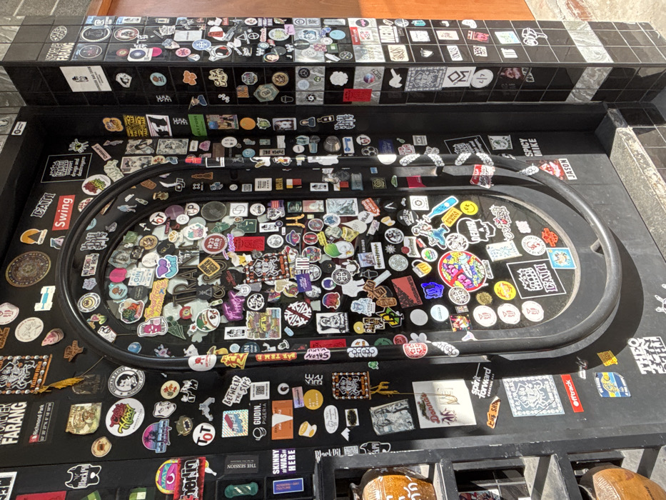A surface, possibly a bar top or table, is covered extensively with an assortment of stickers