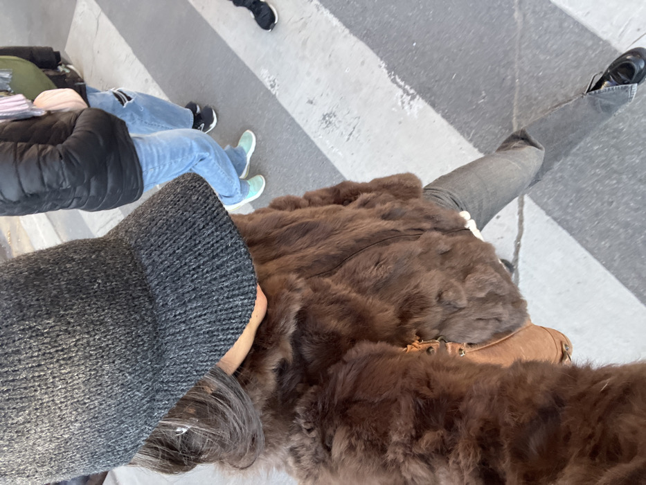 - "An individual wearing a dark grey knitted baseball cap that partially obscures their face, a dark brown fur or faux-fur jacket, grey jeans, and black shoes is captured from an elevated perspective, stepping onto a pedestrian crossing" by FM-t80Kg1, licensed under CC BY 4.0