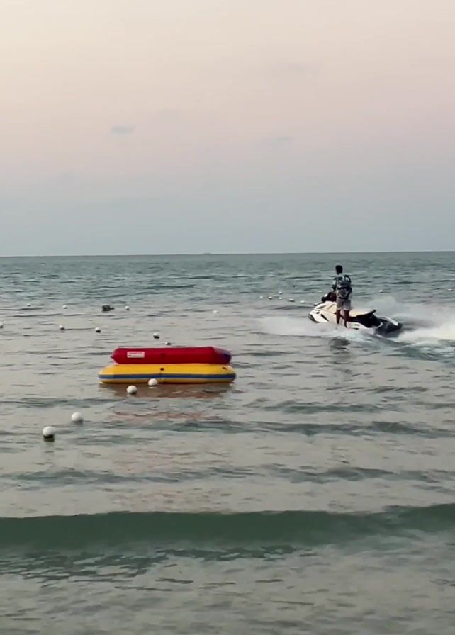 person riding a jet ski on a body of water. The jet ski is white and black, and the rider is wearing a dark shirt with light-colored designs. The body of water is marked with white buoys and green flags, with a yellow-and-red floating platform visible closer to the camera. The sky is pale with a hint of sunset hues. The jet ski moves further into the sea, creating a spray behind it.