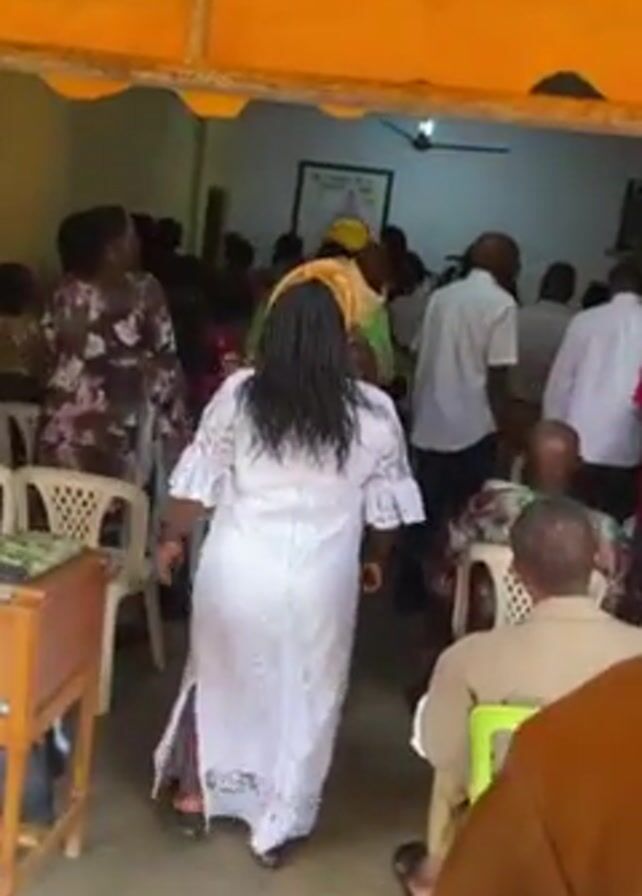 room full of people dancing, dressed in a variety of colorful clothing. Many are wearing traditional African headwear. The room is painted white, and the ceiling is draped with a yellow cloth. There are white plastic chairs lined up along the walls, and some people are seated. A framed sign that reads "THE PICTURE OF A PERFECT MAN" hangs on the wall. The lighting is provided by a fluorescent ceiling light. The overall mood appears to be celebratory.