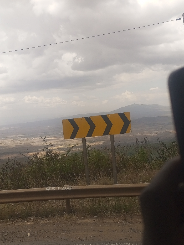 A yellow and black chevron sign stands beside a road overlooking a vast valley. The landscape stretches to a distant mountain range under a cloudy sky. A guardrail with faded white markings runs along the roadside. Vegetation surrounds the sign and the guardrail, obscuring the ground below. Part of a hand holding a phone obscures the right side of the shot.