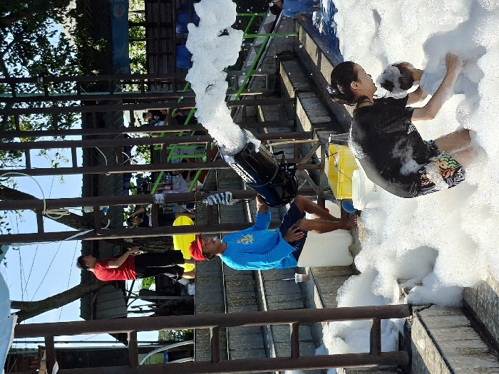 The scene is set in Kecamatan Tulung, Indonesia, at the coordinates -7.592 latitude and 110.65 longitude. A large amount of white foam is being blown by a machine in the center of the frame. It appears to be a foam party. A young adult woman in a black shirt and shorts is helping a young child play in the foam. There is a man standing to the left wearing a blue shirt and jeans. An empty white bucket is on the ground next to a yellow bucket. There are people in the background, but they are blurred. The location is a park-like setting with wooden structures in the background and a grassy area.